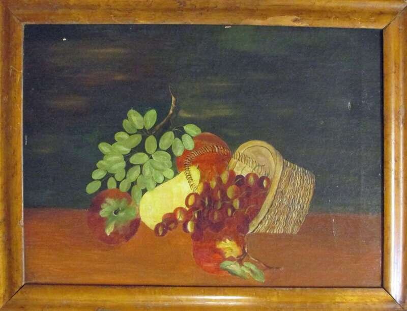American School, 19th century still life with fruit and straw basket