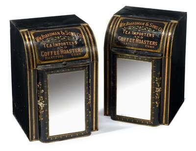 Inscribed, "Wm. Boardman & Sons Co. Tea Importers and Coffee Roasters Hartford Conn.," with roll back lids, mirrored fronts.