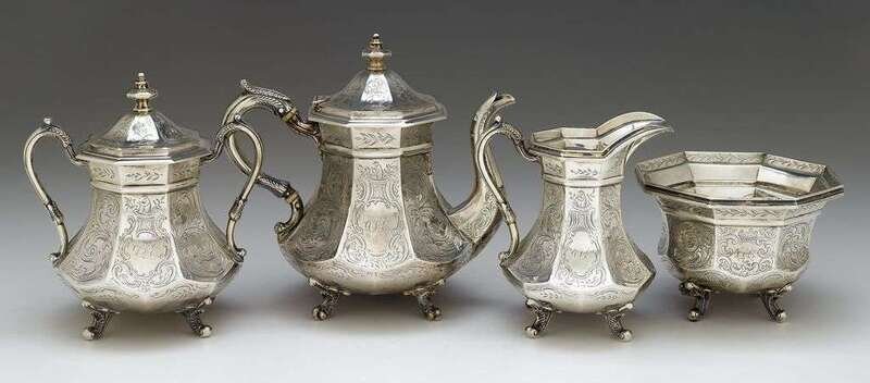 Comprising teapot, covered sugar, creamer and waste bowl, all of octagonal form raised on scrolling feet and profusely engraved with scrolling motif, the teapot, covered sugar and creamer with scrolled handles, monogram.