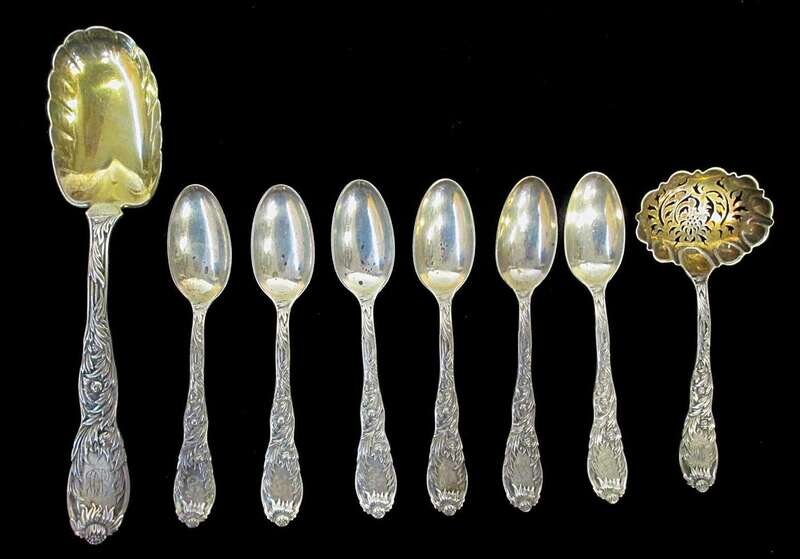 "Chrysanthemum" pattern, comprising six teaspoons, a small sugar sifter, and a berry server, the sifter and server with vermeil bowls, monogram.