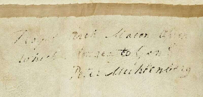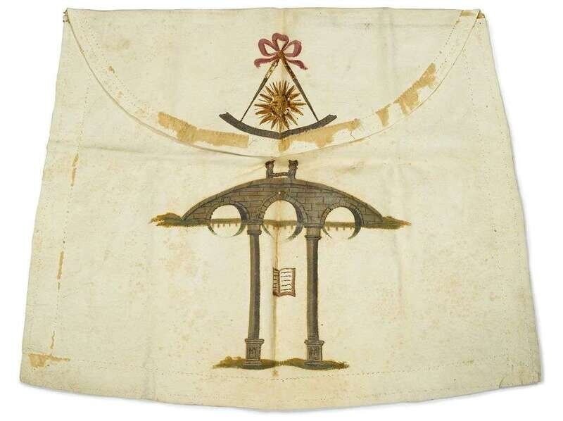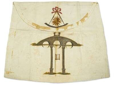 Ink inscription on verso, "Royal Arch Mason Apron belonged to Gen. Peter Muhlenberg," of trapezoidal form with fold over flap, painted with a beribboned compass, sun and bridge with two men shaking hands, the bridge supported by two pillars.