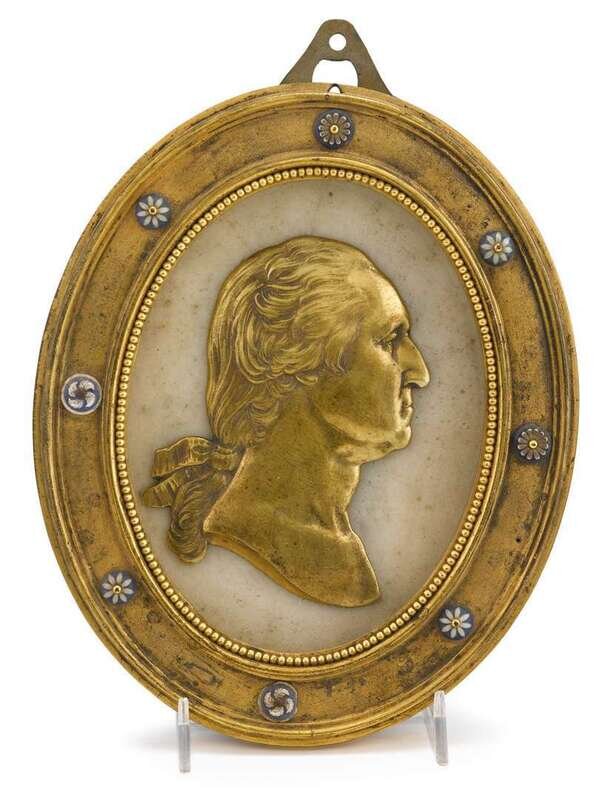 Molded frame with porcelain rosettes enclosing brass profile portrait of Washington on a marble ground.