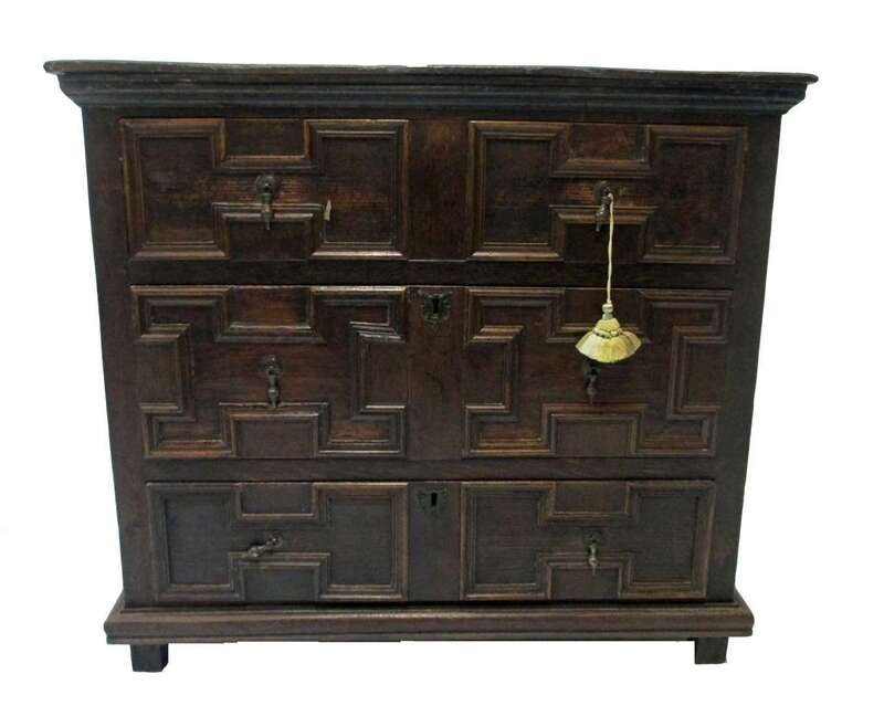 Rectangular molded top above three drawers with applied molding, molded base, double recessed panel sides, rectangular feet.