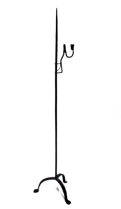 Adjustable arm with candlecup and rush light holder, tapering post on three arched legs ending in pad feet.