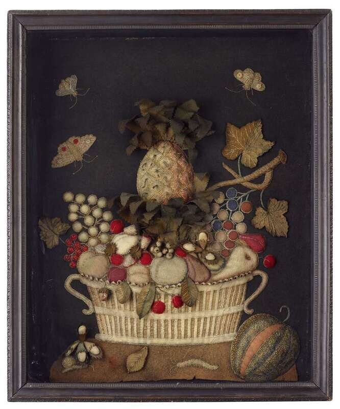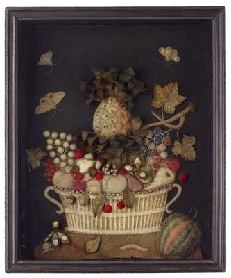 Shadowbox with embroidered feltwork basket of fruit early 19th century