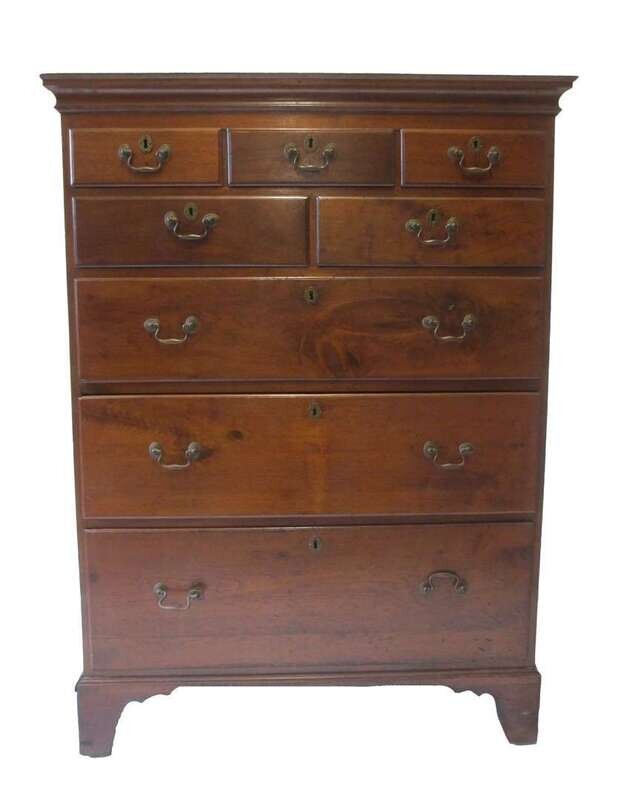 Cove molded cornice above arrangement of eight thumb-molded drawers straight bracket feet.