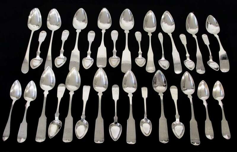 Comprising two tablespoons, Bancroft Woodcock, Wilmington, Delaware; two tablespoons, Thomas J. Megear, Wilmington, Delaware and Philadelphia, Pennsylvania; two tablespoons, Lowell & Senter, Portland, Maine; two tablespoons, Bard & Lamont, Philadelphia, Pennsylvania; one tablespoon, J. Doll, New York, New York; six tablespoons and one teaspoon, F. Curtis, Woodbury, Connecticut; seven teaspoons, R. & W. Wilson, Philadelphia, Pennsylvania; four teaspoons, Conrad Bard, Philadelphia, Pennsylvania; four teaspoons, Lewis Broomall, Philadelphia, Pennsylvania; and one additional teaspoon, all with monogram.