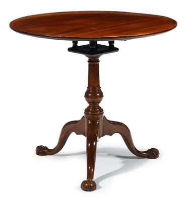 Circular dished top tilts on birdcage and tapering belted ball-form support on cabriole legs ending in ball and claw feet.