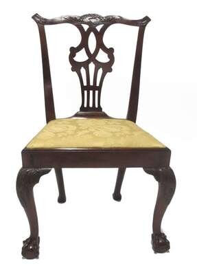 Serpentine leaf carved crestrail and ears, pierced urn splat back, trapezoidal slip seat with plain seat rails, acanthus leaf carved cabriole legs on claw and ball feet.