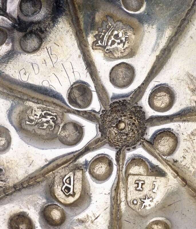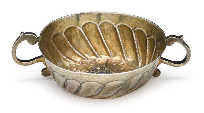 Rare Charles I parcel-gilt silver twin-handled wine taster london, 1638-39, maker's mark ti over star flanked by pellets in shield