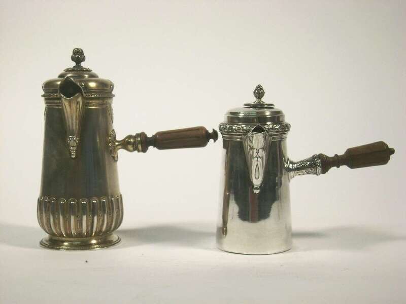 One with marks for Risler & Carré, Paris, of plain tapering cylindrical form with acanthine capped spout, the hinged cover with leaf and berry design to rim and aperture for molinet below pinecone final, the other lacking maker's mark and of similar design with convex fluted lower body, both with Minerva head mark for 950 standard. (2).
