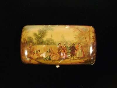 Of rectangular form fitted with silver-gilt or gold and steel sewing implements, the cover showing figures in a pastoral landscape, the implements struck with indistinct maker's marks.
