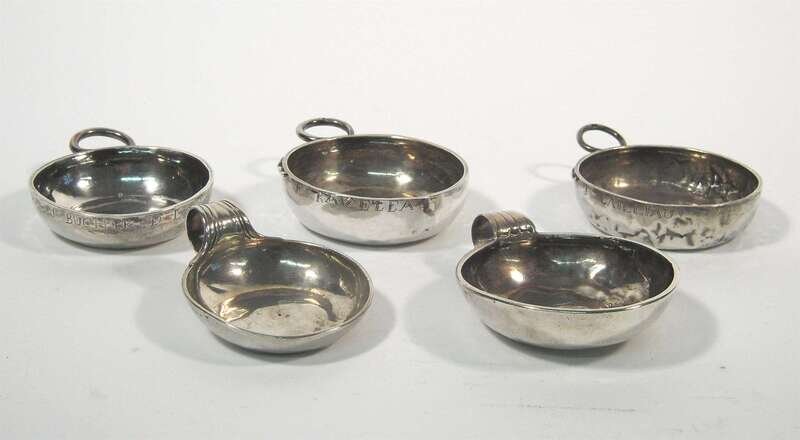 Including a wine taster engraved "J. Bucher D. L. C.," circa 1800, maker's mark PH with key between over D in lozenge; a J. Carlier wine taster with reeded loop handle engraved "F. I. Denevers," 1819-38; a wine taster engraved "F. Raveleau," 1819-38; a wine taster with reeded loop handle, circa 1820, struck with census mark; and a wine taster engraved "J. Cailliau," 1819-38 guarantee mark, mostly 950 standard.