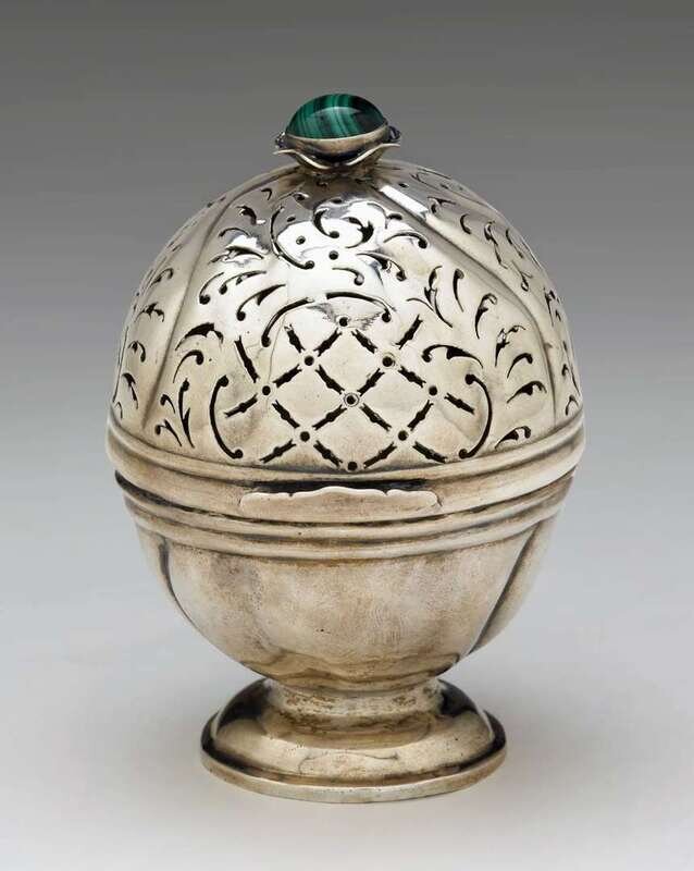 The spherical body hinged at the center, the cover with pierced scroll design and malachite finial, raised on stepped circular foot.