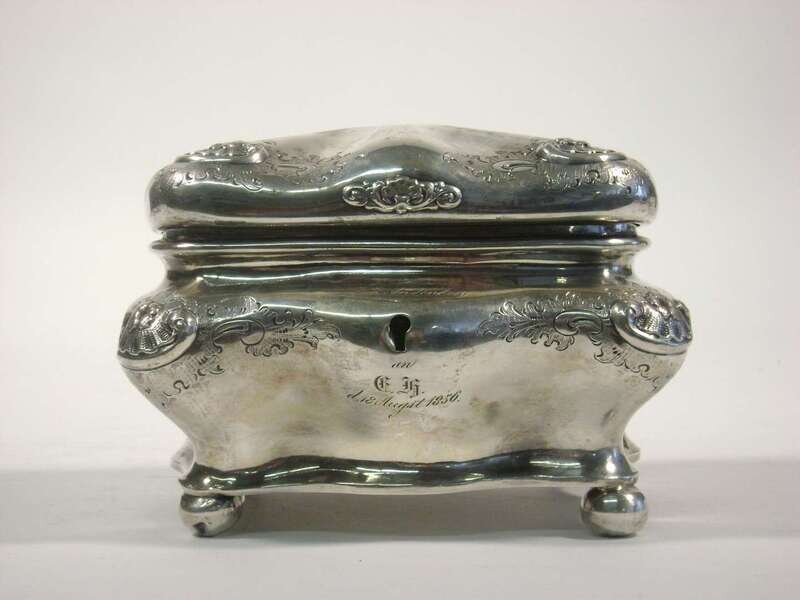 Bombé form raised on four ball feet, the corners worked to show shells centering a flower and surrounded by engraved foliate design, 750 standard.