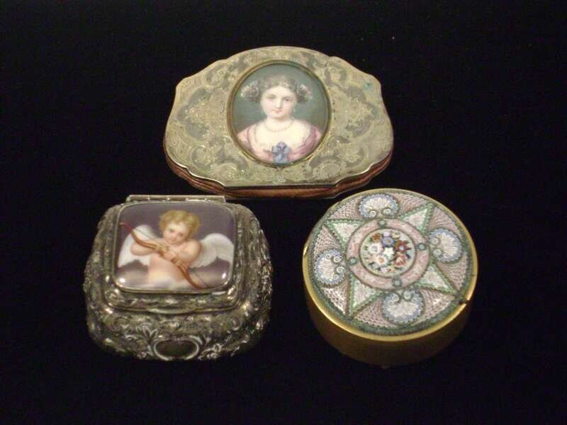 Including a German silver box with hand-painted image of Cupid to the cover; a gilt metal box with micromosaic floral and shell design to hinged lid; and a gilt metal coin purse with oval portrait medallion showing a lady framed by foliated C-scrolls on an engine-turned ground.