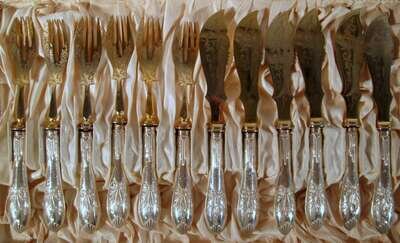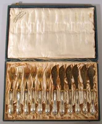 Comprising six each hollow-handled forks and knives with engraved gilt tines and blades, the handles with ribbon design, in original fitted plush-lined box. (12).