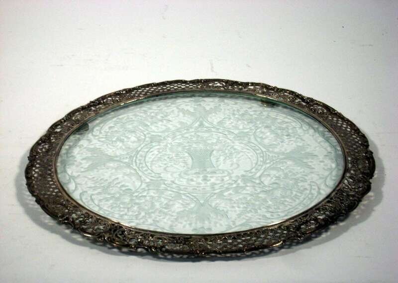 Of circular form, the shaped openwork rim comprising flowers, foliated C-scrolls, and a lattice-work design surrounding a glass plate engraved with a floral-filled basket surrounded by blossoming flowers.