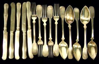 "Fiddle" pattern, comprising five each knives, forks, and spoons. (15).