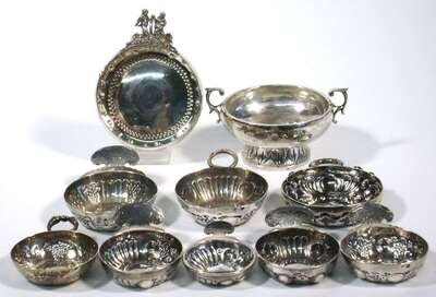 Each with circular bowls, several showing a design of trailing grapevines, partial fluting, and embossed roundels, one with thumbpiece in the form of a couple stomping grapes, together with a brandy bowl of the same firm, all 950 standard, five struck with bigorne countermark. (10).