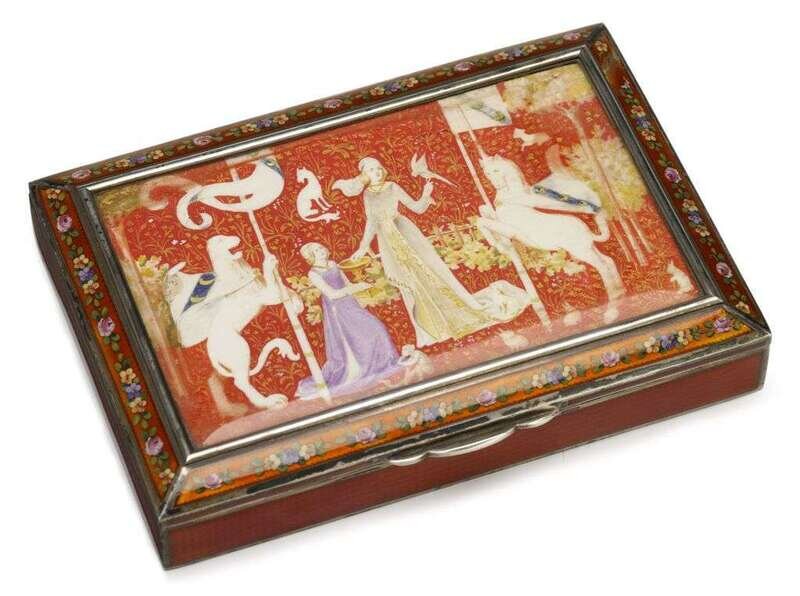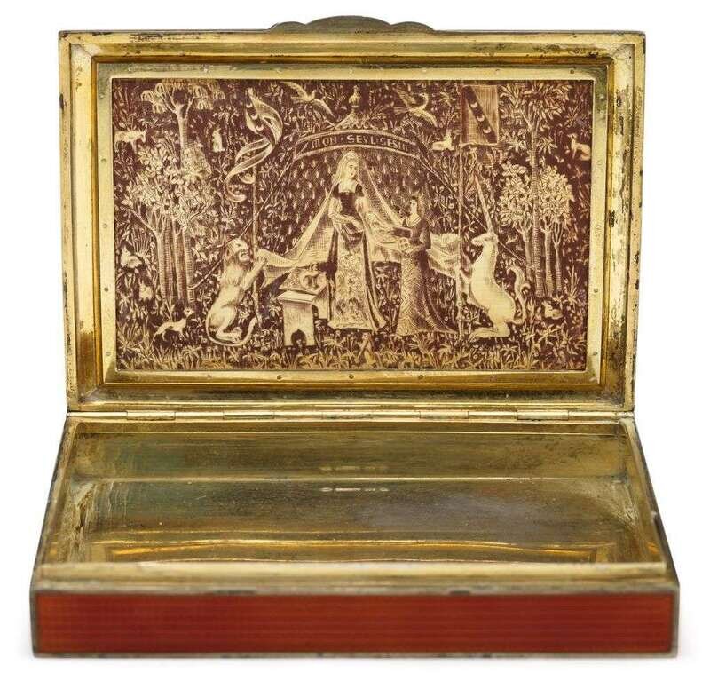 The top and underside of lid showing hand-painted images on ivory after the 15th century French tapestry "The Lady and the Unicorn," the central scene framed by a border of flowers on an orange enamel ground, engine-turning to box, 935 standard.