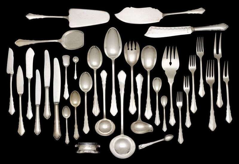 Comprising twelve each dinner, place, luncheon, and fish knives; twelve luncheon, grille, fish, and cake forks; twelve each tablespoons, place spoons, cream soup, bouillon, and five o'clock teaspoons; twelve salt shovels; eleven dinner forks; four salts with glass liners and spoons; ten teaspoons; and twenty miscellaneous serving pieces, 800 standard. (217).