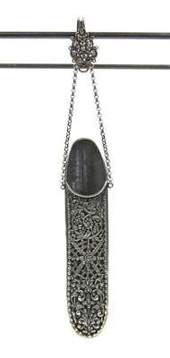 The elongated hollow form with solid back and reticulated front worked to show foliated C-scrolls, arabesques, and bands of guilloche decoration, 800 standard, the clip and holder struck with a star.