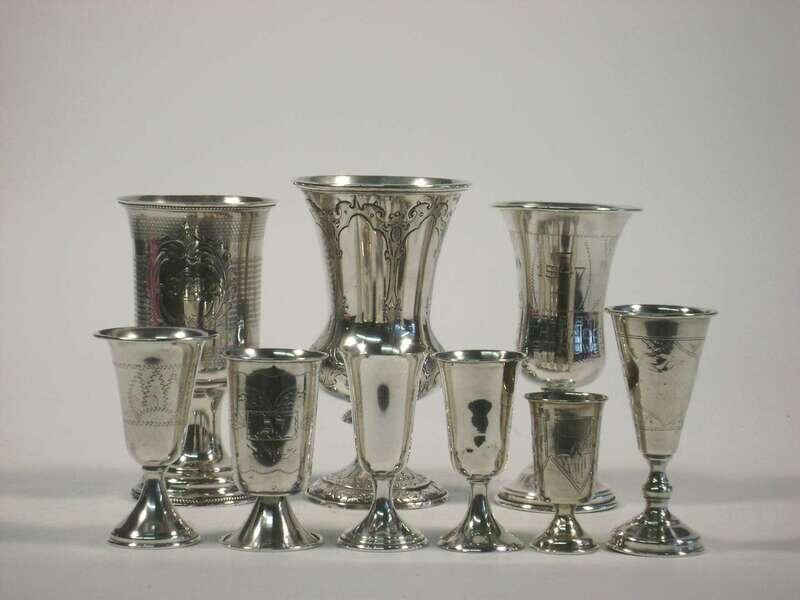 Including an Austro-Hungarian kiddush cup with bright-cut engraved decorative panels to the body and foot, Vienna, 1847; a W. D. Whiting & Co. coin silver engine-turned cup with engraved monogram within foliated reserve; a sterling presentation cup inscribed "1947, Pres. by Cong. Beth Jacob A. S. to M. Ostrower"; and six smaller cups of similar form, one with presentation inscription: "Presented by Beth Am Brotherhood," three with bright-cut engraved naturalistic and architectural motifs, and two plain cups. (9).