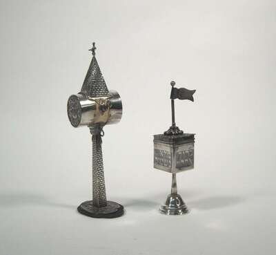 One with silver-mounted ivory box raised on tapering 'brick-work' tower, the other box of trapezoidal form with Hebrew script to body with openwork cover and flag above, both unmarked.