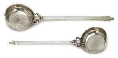 With shaped finial, applied trefoil bracket, and circular bowl, with Georgian script to the reverse of stem; together with a second wine ladle of the same design with script and dated "18 4=19 37," unmarked. (2).
