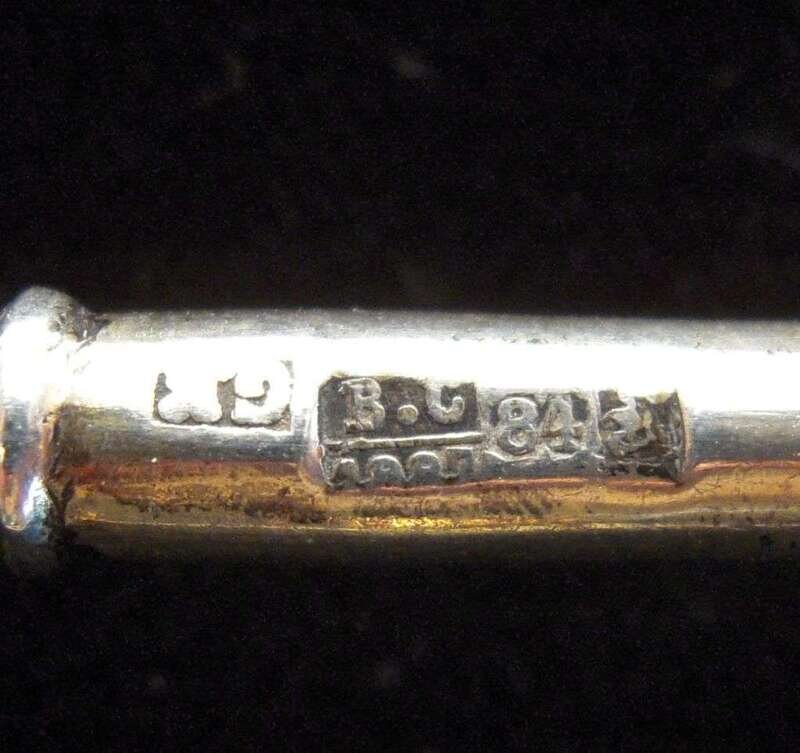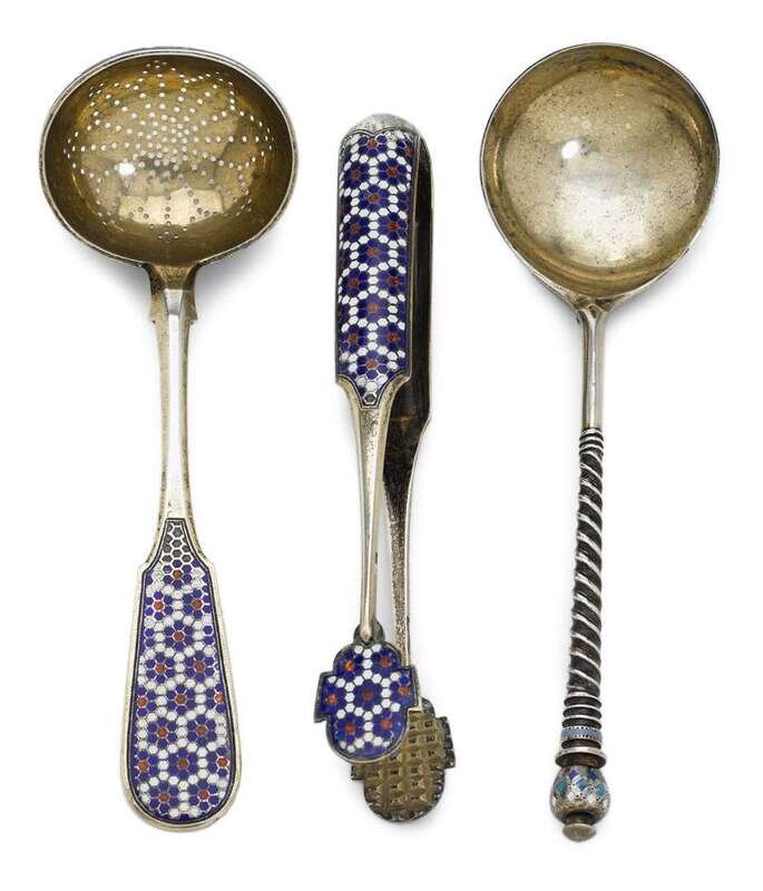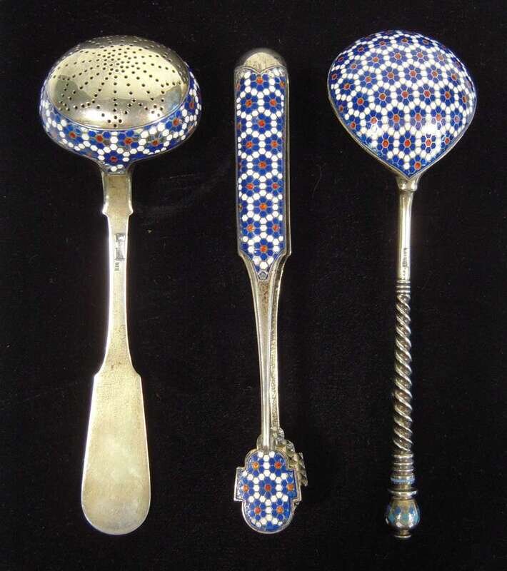 Comprising a serving spoon, strainer, and tongs, with opaque white, translucent red and blue enamel honeycomb design, the spoon with assay marks for Viktor Savinsky and dated 1887, the tongs and strainer with assay marks for Lev Oleks and dated 1889.