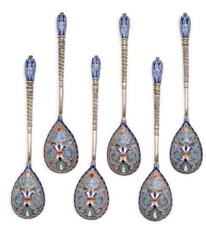 Set of six Russian cloisonné enameled silver-gilt spoons gustav klingert, moscow, 1888, assay master anatoly artsybashev