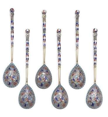Set of six Russian cloisonné enameled silver-gilt spoons gustav klingert, moscow, 1899-1908, assay master ivan lebedkin