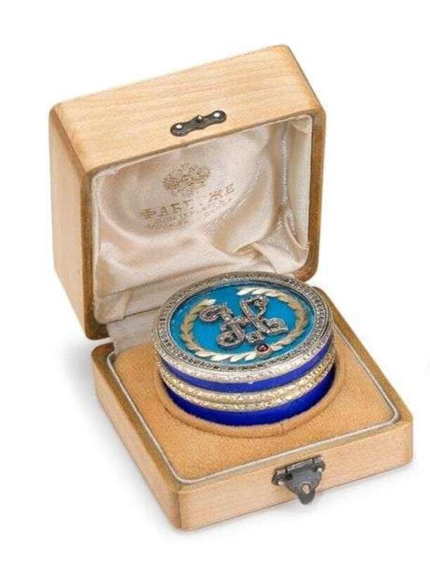 Of cylindrical form with cobalt blue guilloché enamel ground, the top of lid centered with a diamond encrusted monogram of Tsar Nicholas II of Russia on a teal ground and surrounded by a laurel leaf separated by an amethyst cabochon, in fitted wood 'Fabergé' box.