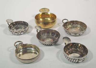 Mostly 950 standard, including a silver-gilt wine taster with the motto "Vive Baccus" to the handle, Louis Ravinet & Charles Denfert, circa 1900; a wine taster retailed by Cartier also by Ravinet & Denfert with fluting and embossed roundels; an Olier & Caron wine taster of the same design, 1920s; a Christofle wine taster with scrolling ring handle; a wine taster possibly by Lagriffoul & Laval struck with crab guarantee mark (800 standard); and a Louis Vuillermet wine taster with inset coin to bowl, Lyon, 800 standard.