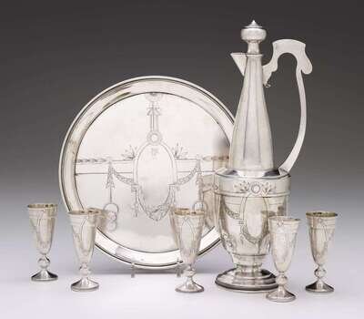 The ewer in the form of a stylized rooster, with tapering neck and detachable finial covering the spout, one side of the body engraved with swags and bellflowers surrounding a vacant medallion, the circular dished tray similarly engraved to the center, together with five matching vodka tots. (7).