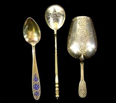 Including a sugar scoop with engraved geometric design to reverse of bowl, Fyedor Yartsyev, Moscow, 1880s; fruit spoon with blue enameling to handle, struck with post 1958 hammer and sickle mark; and a niello spoon with architectural imagery to reverse of bowl, Moscow, 1889, assay master A. Romanov. (3).