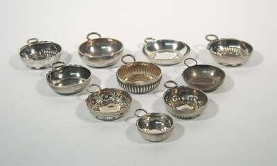 All 800 standard, with circular bowls and ring handles in the form of snakes, five inset with coins, one engraved "Martin Vosne, 1795" and another "P. Deltel," most with maker's marks rubbed or indistinct, one DBF in lozenge. (10).