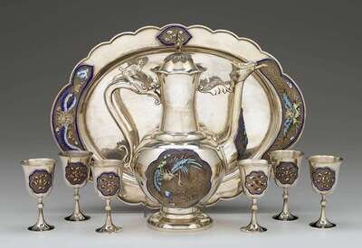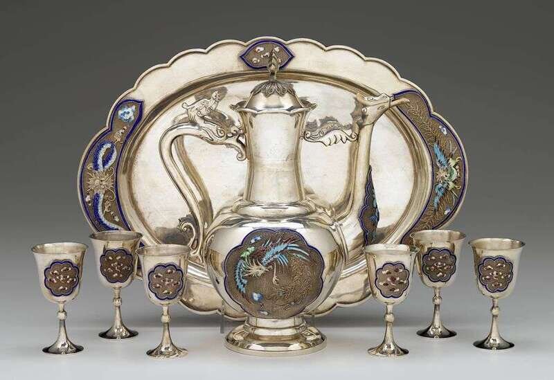 Chinese enameled sterling silver eight-piece tea service 20th century