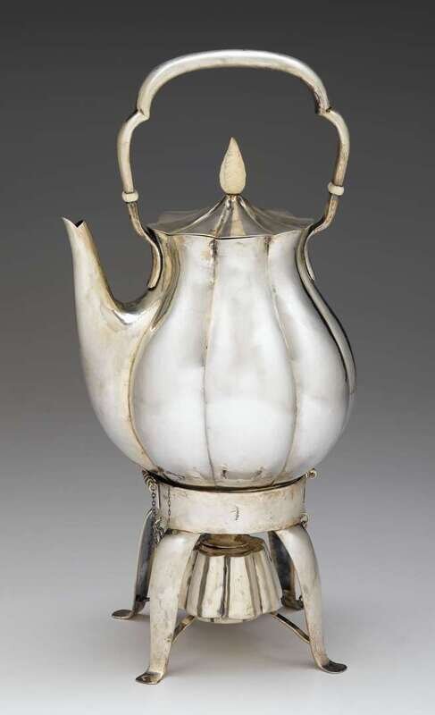 The lobed kettle raised on four outcurving legs, with short angular spout and stylized ivory finial.
