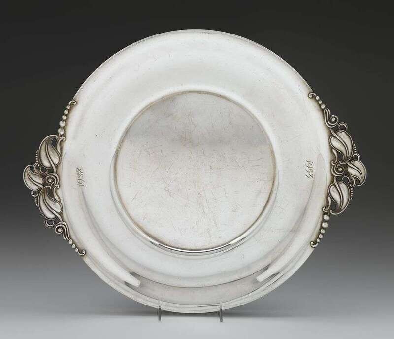 Of circular form, the handles in the Danish Modern taste with leaf and bead design, the dates 1928 and 1953 engraved below the rim.
