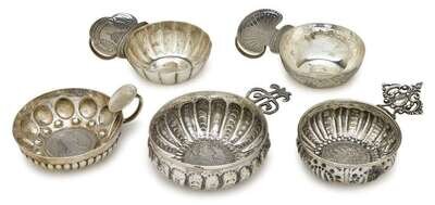 Three Spanish repoussé silver wine tasters inset with coins (two post 1934, maker's mark MG, 915 standard and the third possibly 19th century Cordoba) and two Peruvian wine tasters marked Ilaria, 950 standard, both with engraved handles, one with lobed body, the other with engraved design of swags and flowerheads to exterior of bowl. (5).