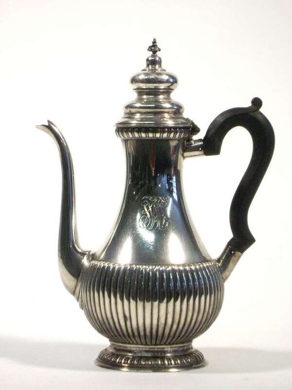 Of baluster form with fluting to lower body raised on conforming foot, with swan-neck spout, triple dome cover, and ebonized wood handle, monogrammed.