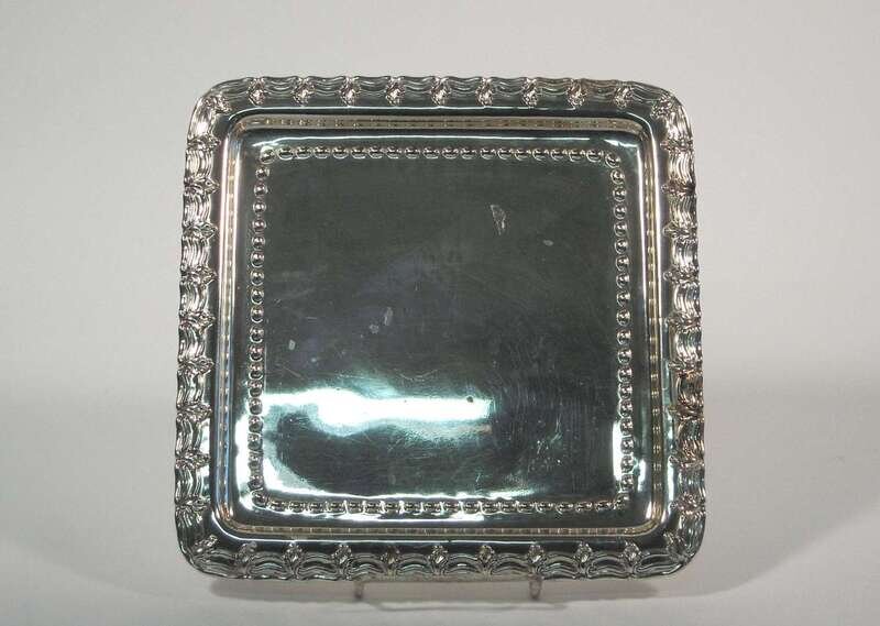 Square form raised on four cast lion's paw feet, the tray with alternating scroll and leaf design to rim with repoussé beaded motif to well.