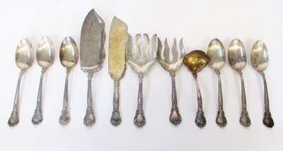 "Chantilly" pattern, comprising six serving spoons, a fish slice, fish serving set, cold meat fork, and a ladle, monogrammed.