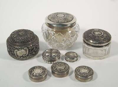 Including an enameled silver mounted cut glass jar with matching powder puff; repoussé silver box profusely decorated with flowers; and three boxes of a similar design; together with glass powder jar with silver cover, a hinged pill box, and a lid, all marked "Sterling." (8).
