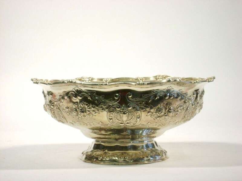 Shaped circular form raised on conforming foot, repoussé design of floral blossoms and foliated scrolls, monogrammed.