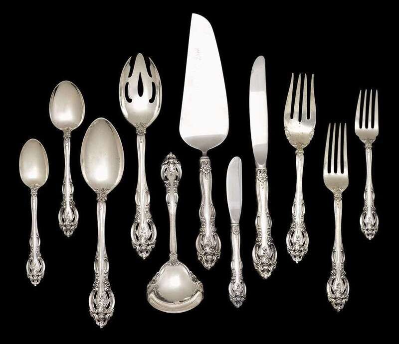 "La Scala" pattern, comprising twelve each dinner and butter knives, dinner and salad forks, teaspoons, and tablespoons; three serving spoons; a salad set; and one each serving fork, pie server, and ladle, in fitted wood box. (80).