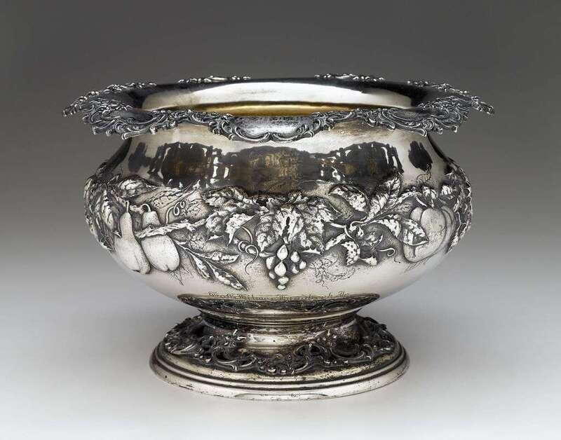 The large circular bowl repoussé worked to show fruit clusters and trailing branches and vines, with openwork foliated-scroll rim, raised on conforming foot, monogrammed, the presentation inscription dated 1950.