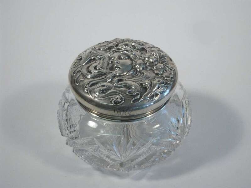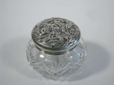 The cut glass body with repoussé silver lid showing a maiden with flowing hair surrounded by flowers, monogrammed.